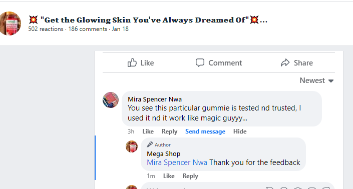 “I’ve tried so many products, but Glutathione Whitening Gummies are a game-changer! Within a week, my skin felt smoother, and those dark spots started to fade. Plus, they taste amazing! My go-to beauty essential now. Highly recommend!”